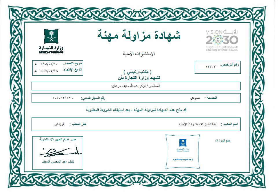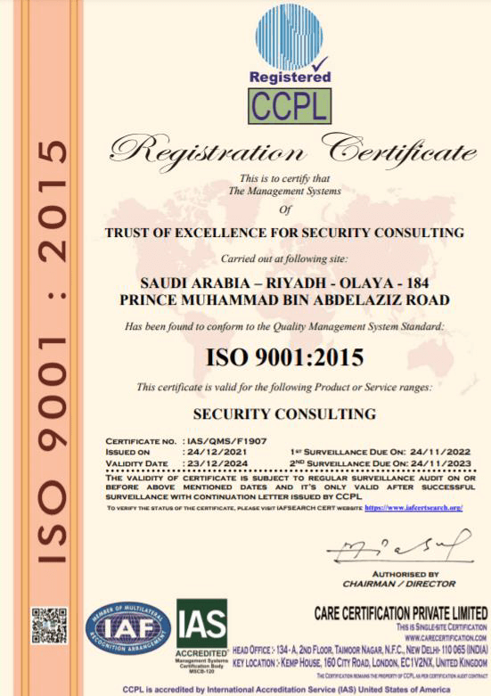 شركة ثقة التميز هي جهة استشارية مرخّصة من الوزارة في مجال الأمن الصناعي في المملكة العربية السعودية. ويُخوّلها هذا الترخيص بإعداد تقييمات المخاطر، والتصاميم، واعتماد اختبارات الأنظمة المتكاملة. كما يمتد شرط الامتثال للأمن المادي ليشمل العمليات الأمنية، وقد قدّمت شركة ثقة التميز استشارات واسعة لدعم عمليات الأمن الصناعي في مختلف أنحاء المملكة.